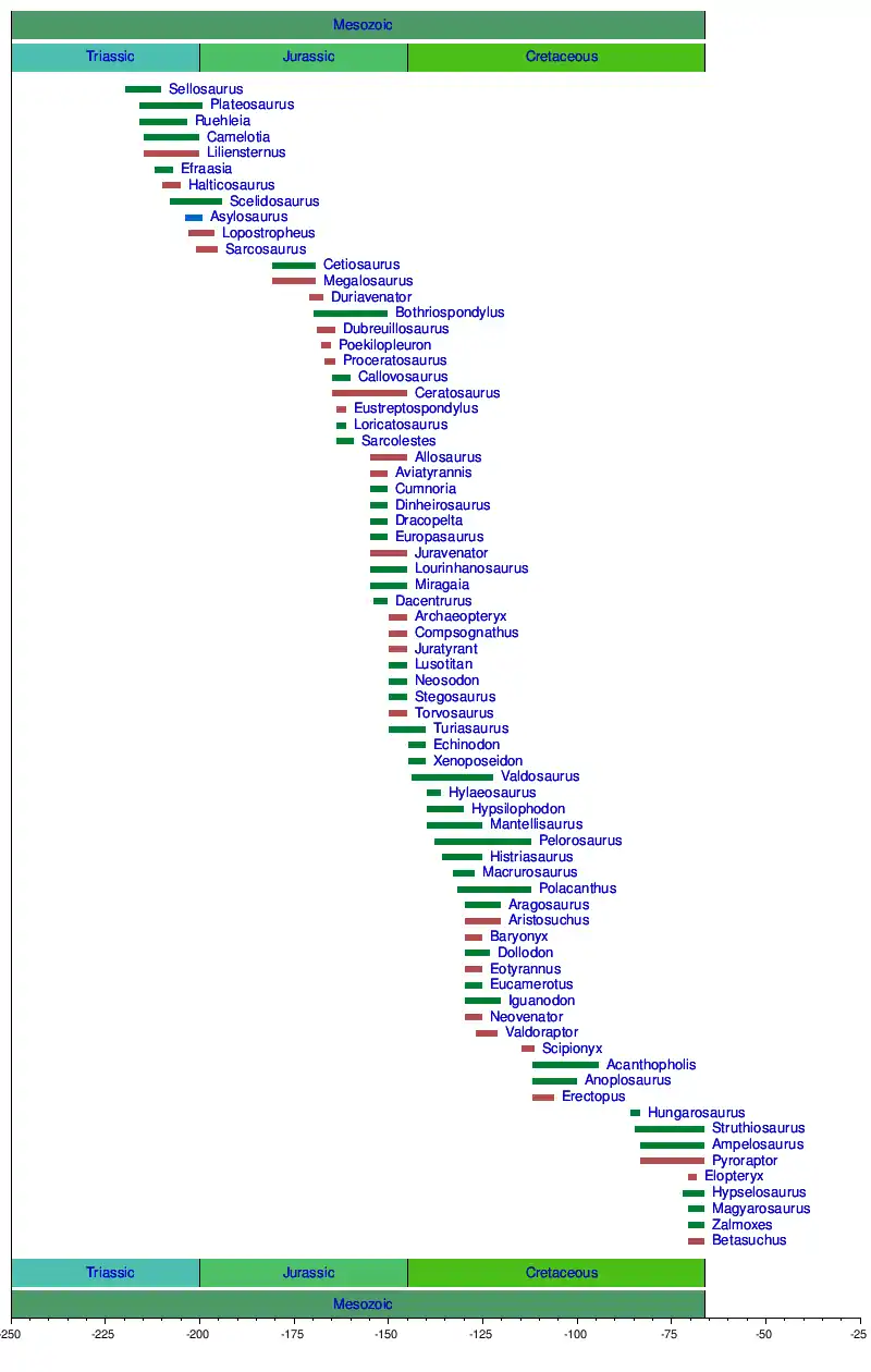 MesozoicTriassicJurassicCretaceousBetasuchusZalmoxesMagyarosaurusHypselosaurusElopteryxPyroraptorAmpelosaurusStruthiosaurusHungarosaurusErectopusAnoplosaurusAcanthopholisScipionyxValdoraptorNeovenatorIguanodonEucamerotusEotyrannusDollodonBaryonyxAristosuchusAragosaurusPolacanthusMacrurosaurusHistriasaurusPelorosaurusMantellisaurusHypsilophodonHylaeosaurusValdosaurusXenoposeidonEchinodonTuriasaurusTorvosaurusStegosaurusNeosodonLusotitanJuratyrantCompsognathusArchaeopteryxDacentrurusMiragaia (dinosaur)LourinhanosaurusJuravenatorEuropasaurusDracopeltaDinheirosaurusCumnoriaAviatyrannisAllosaurusSarcolestesLoricatosaurusEustreptospondylusCeratosaurusCallovosaurusProceratosaurusPoekilopleuronDubreuillosaurusBothriospondylusDuriavenatorMegalosaurusCetiosaurusSarcosaurusAsylosaurusScelidosaurusHalticosaurusEfraasiaLiliensternusCamelotiaRuehleiaPlateosaurusSellosaurusMesozoicTriassicJurassicCretaceous