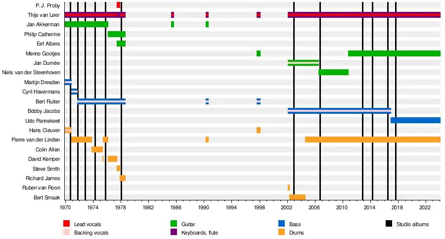 In early 2002, Thijs van Leer reformed Focus again with new guitarist Jan Dumée, bassist Bobby Jacobs and drummer Ruben van Roon.[17] Bert Smaak replaced van Roon shortly after the reformation to complete work on the comeback album Focus 8, and remained until August 2004 when van der Linden returned to the band.[18] Dumée was replaced by Niels van der Steenhoven in time for Focus 9 / New Skin in 2006,[19] before Gootjes returned for a second stint in 2010.[20] After the band released Focus X and Golden Oldies, Udo Pannekeet replaced long-time bassist Jacobs in December 2016.[21] The Focus Family Album and Focus 11 followed in 2017 and 2018, respectively.