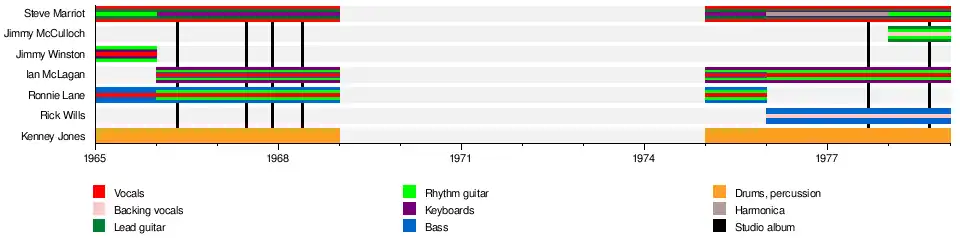 Winston left the band for a solo career shortly after.[5][6] In a 2000 interview, Kenney Jones 'stated' the reason Winston was fired from the band was because "He (Winston) got above his station and tried to compete with Steve Marriott." Reality is he left.[7] Ian McLagan, of the Muleskinners, replaced Winston as the keyboardist.[5] McLagan played his debut performance with them on 2 November 1965.[8] After "Sha-La-La-La-Lee" became their first top ten hit, the Small Faces enjoyed widespread success, particularly in the UK and mainland Europe. Despite rumours that the group split on New Year's Eve of 1968,[9] the truth is that they were actually obligated to perform a few scheduled live performances during the earlier parts of 1969 before finally separating, with Marriott forming Humble Pie, and the remaining Small Faces created Faces with Rod Stewart and Ronnie Wood, both formerly of The Jeff Beck Group.