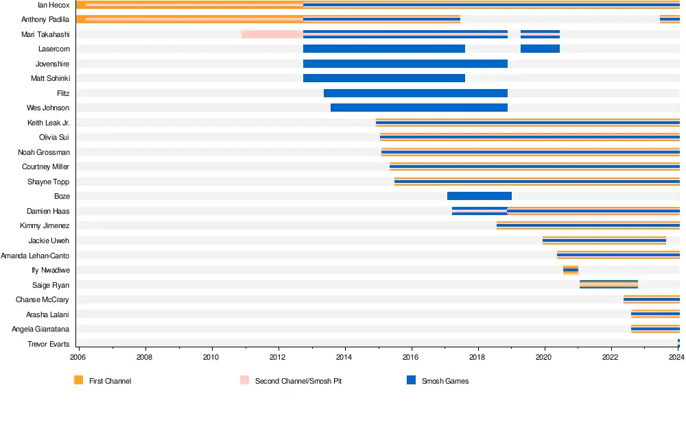 Smosh is an American YouTube sketch comedy-improv collective founded by Anthony Padilla and Ian Hecox. Initially starting as a comedy duo of Hecox and Padilla, the channel began expanding to include additional cast members starting in 2010, with the majority of new cast members joining after Smosh was acquired by Alloy Digital (later rebranded to Defy Media) in 2011.[1] Padilla left the channel in 2017 to pursue his independent channel, while Hecox remained with Smosh through the merge with Mythical Entertainment. In June 2023, it was announced that both Padilla and Hecox had bought Smosh from Mythical Entertainment, and the two founders would resume working together on Smosh as an independent entity.