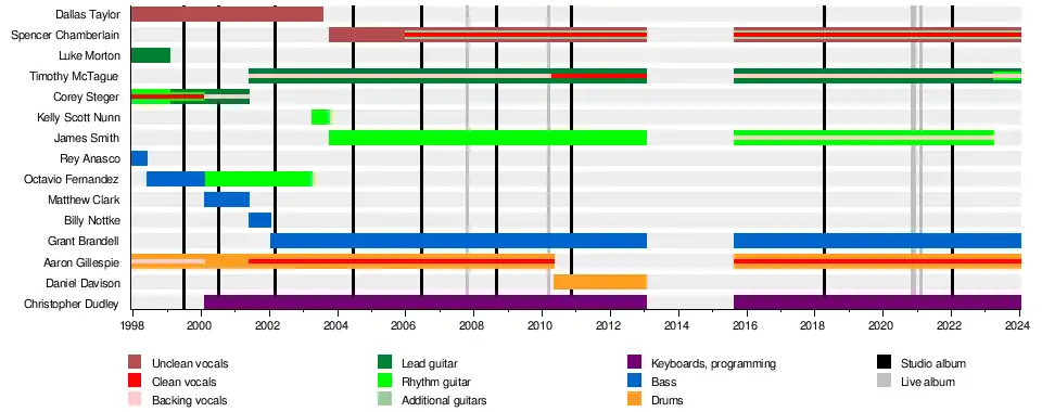 | Matt Tarpey | 2003 | lead vocals | Tarpey filled in on vocals for a tour after original singer Dallas Taylor left the band in July 2003.[10] | |