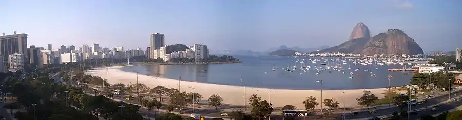 A panoramic view of Praia de Botafogo (Botafogo Beach) with Pão de Açúcar and Morro da Urca in the background.