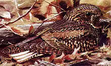 Nightjars are medium-sized nocturnal birds that usually nest on the ground. They have long wings, short legs, and very short bills. Most have small feet, of little use for walking, and long pointed wings. Their soft plumage is camouflaged to resemble bark or leaves.