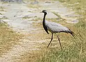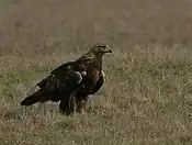 Bustards are large terrestrial birds mainly associated with dry open country and steppes in the Old World. They are omnivorous and nest on the ground. They walk steadily on strong legs and big toes, pecking for food as they go. They have long broad wings with "fingered" wingtips and striking patterns in flight. Many have interesting mating displays.