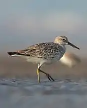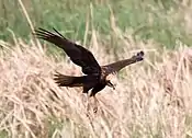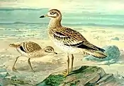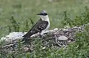 Bustards are large terrestrial birds mainly associated with dry open country and steppes in the Old World. They are omnivorous and nest on the ground. They walk steadily on strong legs and big toes, pecking for food as they go. They have long broad wings with "fingered" wingtips and striking patterns in flight. Many have interesting mating displays.