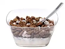 This is a list of breakfast cereals. Many cereals are trademarked brands of large companies, such as Kellanova, WK Kellogg Co, General Mills, Malt-O-Meal, Nestlé, Quaker Oats and Post Foods, but similar equivalent products are often sold by other manufacturers and as store brands.
