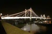 ![]() | Albert Bridge | Combined Ordish–Lefeuvre / suspension / beam | 1873 | Kensington and Chelsea: Chelsea | Wandsworth: Battersea | Kensington and Chelsea London Borough Council |