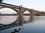 ![]() | 11 | Preobrazhenskyi Bridge | Мости Преображенського | 140 m (460 ft)(x3) | 560 m (1,840 ft) | Arch 2 levels concrete deck arch | 1952 | Zaporizhzhia 47°50′43.6″N 35°05′01.5″E / 47.845444°N 35.083750°E | Zaporizhzhia | [S 13] [4] | |