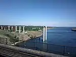 ![]() | 21 | Antonivka Road Bridge | Антонівський міст | 105 m (344 ft)(x2) | 1,366 m (4,482 ft) | Box girder Prestressed concrete 70+2x105+70 | 1985 | Kherson 46°40′11.3″N 32°43′12.9″E / 46.669806°N 32.720250°E | Kherson | [S 23] [7] | |