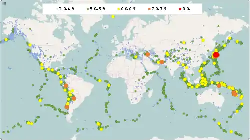 ![]() Approximate epicenters of the earthquakes in 2011