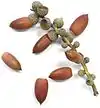 ![]() | ![]() | English / French oak | Quercus robur | Native to most of Europe, and from Anatolia to the Caucasus, and also to parts of North Africa | Acorns (ripening in September to October), too bitter when raw, but used chopped and roasted as a substitute for almonds, or then ground as a substitute for coffee. After leaching out the bitter tannins in water, acorn meal can be used as grain flour. | [22] |