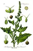 ![]() | Good-King-Henry | Chenopodium bonus-henricus | Most of Europe, West Asia and eastern North America | Young shoots (until early summer) and leaves (until August). The shoots can be cooked like asparagus, and the leaves like spinach. | [39] | |