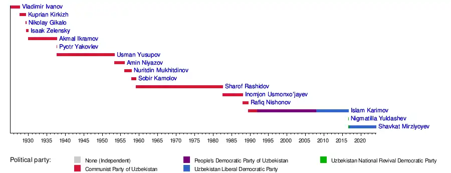 Below is the list of leaders of present-day Uzbekistan since the establishment of Uzbek SSR in 1924.