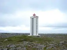| Straumnesviti nyrðri | L4650 | Norðurland Vestra | 1942 | 20 m (66 ft) | 10 m (33 ft) | White/black vertical striped octagonal tower, red lantern house. | Active | ![]() |