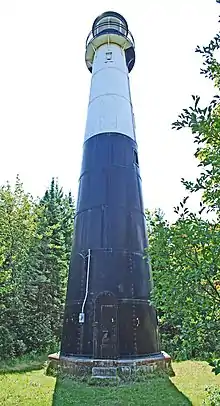 - ↑ Replaced with pole light. Tower moved to Sault Ste. Marie Coast Guard station.