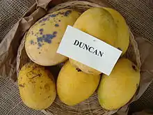 United States | Duncan mango was patented by David Sturrock of West Palm Beach, Florida. The patent has long since expired. Duncan fruits in clusters and has excellent disease resistance. It is a mid-late season mango. |