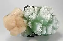 Apophyllite crystals sitting right beside a cluster of peachy bowtie stilbite