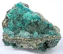 Aurichalcite needles spraying out within a protected pocket lined by bladed calcite crystals