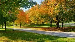 1873 | 123 acres (50 ha) | 39°44′01″N 86°08′45″W / 39.733528°N 86.14573°W | Garfield Park is the oldest municipal park in Indianapolis. Features include the Burrello Family Center, MacAllister Center for the Performing Arts, an aquatic center, ball diamonds, a basketball court, a community arts center, a conservatory and sunken gardens, football/soccer fields, a public library branch, playgrounds, shelters, sledding hill, statuary, tennis courts, and trails, notably Pleasant Run Greenway.[24] Originally named Southern Park, it was renamed to honor President James A. Garfield in 1881.[25] It is part of the Indy Birding Trail.[7] |