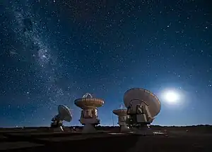 Four of the sixty four total antennas of the ALMA radio telescope, at the Atacama Large Millimeter Array (ALMA)
