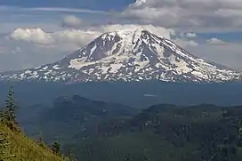 The Mount Cayley volcanic complex on August 13, 2005. Summits left to right are Pyroclastic Peak and Mount Cayley.