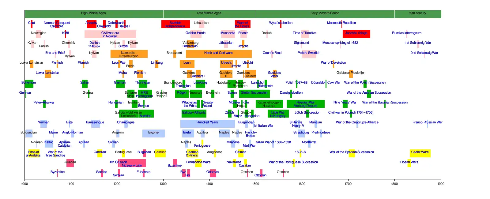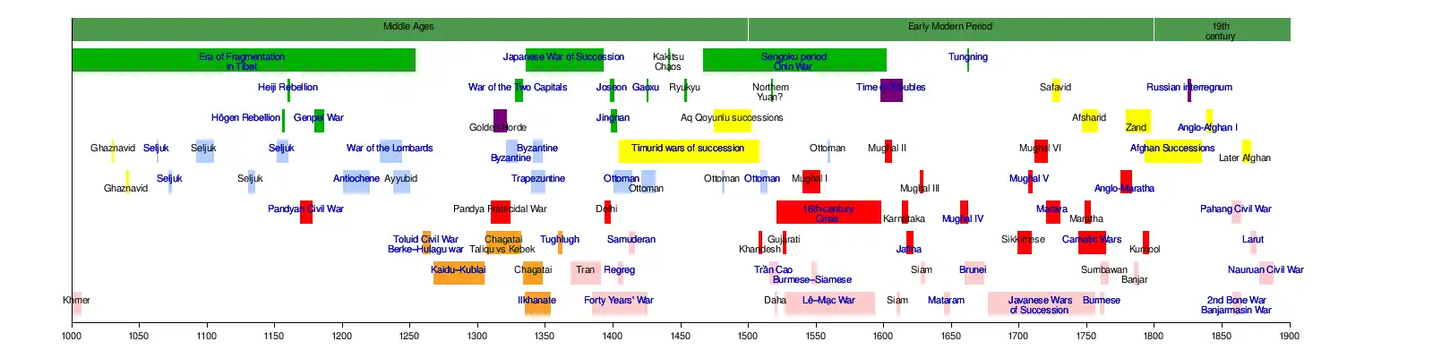 Note: Wars of succession in transcontinental states are mentioned under the continents where their capital city was located. Names of wars that have been given names by historians are capitalised; the others, whose existence has been proven but not yet given a specific name, are provisionally written in lowercase letters (except for the first word, geographical and personal names).