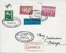 Post of Lithuania has introduced special stamp for the items mailed on the domestic air mail service; such numbered envelopes soon became numismatic rarity and an object of forgery.[5]