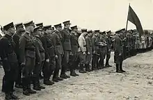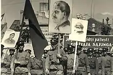 The Soviets sought to transform the Lithuanian Armed Forces into the Lithuanian People's Army, which would be very similar to the Red Army.[1] There was a particular urgency to eliminate the army's ties with the Lithuanian Riflemen's Union; thus all 22 military commanders (there also were the same number of riflemen teams) of 20 counties, Vilnius, and Kaunas were removed or transferred to other positions.[3] On 2 July 1940, the institution of military chaplains was abolished and the promotion of religion was banned.[1] On 6 July 1940, the Political Board along with an institution of communist political leaders (politruks) was established to control the activities of all commanders.[1] The Lithuanian national symbols and shoulder straps were abolished, and a surveillance system was introduced.[1] According to Stasys Pundzevičius, in order to suppress the national sentiment of the army, the political leadership of the army, through the army commander, demanded that the singing of the Lithuanian national anthem be banned and national flags be removed, while the officers were fired from the army only by the orders of the political leadership based on the pre-prepared lists.[7] The Soviet propaganda about Lithuania's accession to the Soviet Union was spread in the army, and soldiers were forced to take part in political rallies.[1][8][9] Pursuant to the directive of the People's Commissar of Defense of the Soviet Union of 17 August 1940, the Council of People's Commissars of the Lithuanian SSR abolished the Ministry of National Defense of Lithuania by a resolution of 27 August 1940.[1]