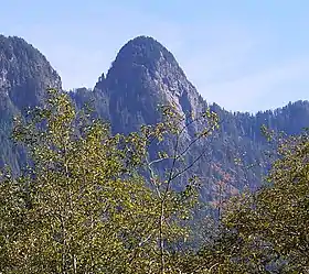 The history of the formation of the Cascade Mountains dates back millions of years ago to the late Eocene Epoch.[4] During the Pleistocene period dating back over two million years ago, glaciation advancing and retreating repeatedly scoured the landscape leaving deposits of rock debris.[4] The last glacial retreat in the area began about 14,000 years ago and was north of the Canada–US border by 10,000 years ago.[4] The U-shaped cross section of the river valleys is a result of that recent glaciation. Uplift and faulting in combination with glaciation have been the dominant processes which have created the tall peaks and deep valleys of the Cascade Range.