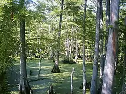 Cypress Bayou is the name applied to a series of wetlands at the western edge of Caddo Lake, in and around Jefferson, Texas, making up part of the largest Cypress forest in the world. The bayou is divided into three areaseach part of the watershed of a small river or creekLittle Cypress, Big Cypress, and Black Cypress. The features had been modified, to an extent, by human beings in the 19th and 20th centuries, but today is endangered by pollution, development, and the deforestation, through clear cutting, of the Piney Woods that surround the bayous. Large groves of trees have completely died off, and land has been recently deforested up to the water's edge.[1]