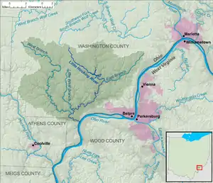 The Little Hocking River is a small tributary of the Ohio River, 18.4 miles (29.6 km) long, in southeastern Ohio in the United States. Via the Ohio River, it is part of the watershed of the Mississippi River, draining an area of 102 square miles (260 km2) on the unglaciated portion of the Allegheny Plateau. The river flows for its entire length in southwestern Washington County; its tributaries also drain a small area of southeastern Athens County.[4][5]