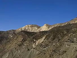 The rocks of the lower slopes of the mountain comes from the Franciscan Assemblage, which creates serpentine soils that support a unique chaparral ecosystem. Large deposits of dark-red cinnabar are exposed above ground. The middle slopes of the mountain are dominated by the Espada Formation. The summit largely consists of Matilija Sandstone. There is a small band of Temblor Formation, a Great Valley Sequence unit usually found much farther north, encircling the high ridge of the mountain. North slope outcrops consist largely of Espada Formation rocks, with a band of serpentinite splitting the Espada section in half.[4]