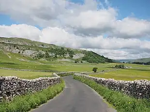Littondale is a side dale to the west of Wharfedale and follows the River Skirfare. The nature of the dale and its characteristic smooth form was the result of many ice ages, especially the one 20,000 years ago. As the glacier for that age receded it left retreat moraine, an example of which can be found at Skirfare Bridge. Like neighbouring Wharfedale, Littondale comprises mainly Great Scar Limestone and Yoredale rock. The dale has a number of shake holes and sink-holes that lead to cave systems such as at Boreham Cave.[4] At the head of the dale is Pen-y-ghent, one of the Yorkshire Three Peaks.
