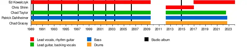 ![]() Live performing in 2008. L–R: Patrick Dahlheimer, Ed Kowalczyk, Chad Taylor, Chad Gracey (in background), and Adam Kowalczyk | |