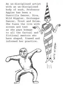 From 1982 to 2000, Aggiss taught visual performance at the University of Brighton. The course produced several 'fascinating independent artists',[74] including Ian Smith, Louise Rennison, Ralf D'Arcy Higgins, Virginia Farman, Marisa Carnesky and Miriam King, who all performed in Aggiss and Cowie's shows, and Anne Seagrave, Lizzy Le Quesne, Silke Mansholt, Michael Pinsky, Nikki Ward, Esther Rollinson, Miranda Henderson, Marc Rees, George Chakravarthi, Chris Umney and Magali Charrier. After 2000, she switched to research at the same institution. Yet she continues to teach, offering 'Mistress classes, workshops and residencies.'[75]