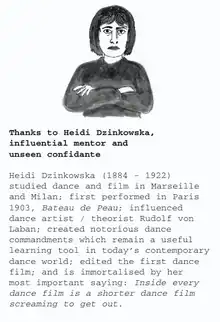 The show comprised Aggiss's live 'reconstructions' and black and white films of dances, in which Lea Anderson played Heidi. Aggiss also read from Dzinkowska's memoir, A Life in Dance ('known as every dancer's bible'), sharing Dzinkowska's 'dance commandments', some of them direct quotations from Hilde Holger