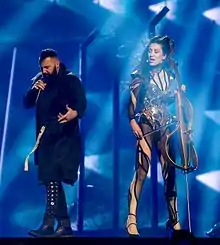 The Bosnian performance featured Deen separated by a barbed wire prop from the other performers, who were covered by golden metallic foil.[33][34][35] The performance made references to the European migrant crisis and the refugees fleeing Bosnia and Herzegovina during the Bosnian War between 1992 and 1995. As the performance progressed, the performers were all symbolically reunited. The stage lighting and LED screens displayed predominantly blue colours which transitioned to red. The creative director for the Bosnian performance was Haris Pašović. The black costumes for Deen and Jala were designed by Tom Rebl, while Dalal's red metallic dress and Ana Rucner's metallic black and nude bodysuit were designed by Juraj Zigman.[36] Two backing vocalists join the four performers on stage: Ena Đapo and Zorana Guja.[37]