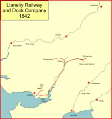 The Llanelly Railway and Dock Company was an early Welsh railway system. It opened its first short line and a wet dock at Llanelly in 1834, and soon went on to build a longer line from Llanelly to serve pits in the Amman Valley, and then on to Llandilo, reached in 1857. The Llanelly company leased and worked the Vale of Towy Railway on to Llandovery, from 1858.