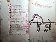 The Llibre de Menescalia, is a Catalan manuscript, translated into Spanish as Libro de Albeytería,[1] that became the reference veterinary work about horses of the 15th and 16th centuries. It should be brought to mind" that, in those days, the Catalan language, had spread throughout the Mediterranean, apart from being understood in a broad part of Europe for its similarity to Occitan (which includes Gascon, Provençal, etc..), the Lombard, the Milanese, etc ... The book had as well, a great success in Castile, for it was translated into Spanish in 1499 and republished in that language several times. The work consists of two books. The first, Book of Menescalia, deals with the external anatomy of the horse, qualities that must concur for the choice of the parents, coat, the way to raise the foal, etc. The second, Treatise of the Menescalia of the mules, is about the mules widely used in Catalonia.[2]