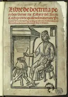 The Llibre del Coch, or Llibre de doctrina per a ben servir, de tallar y del art de coch cs (ço es) de qualsevol manera, potatges y salses compost per lo diligent mestre Robert coch del Serenissimo senyor Don Ferrando Rey de Napols, is a Catalan recipe book written around 1490 by Master Robert de Nola. Its earliest preserved printed edition is from 1520, published in Catalan in Barcelona.[1] It includes mainly recipes from the Catalan cuisine of the time, some of them inherited from the Llibre de Sent Soví, and some from neighboring countries, such as the Occitan cuisine and the Italian cuisine, including traditions from different areas dominated by the Crown of Aragon, which at that time was spread to the northeastern Mediterranean, Southern Italy, Corsica and Sicily. Despite not including Castilian recipes,[2] was also very successful in Castile, was translated into Spanish in 1525 and republished in this language several times. It is considered of great value for acquiring a good knowledge about the gastronomy of the Renaissance.
