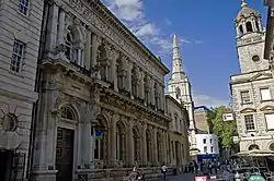 Originally the West of England and South Wales Bank built by Bristol architects William Bruce Gingell (1819–1899) and T.R. Lysaght in 1854. Gingell was one of the most progressive Bristol architects of the latter part of the nineteenth century. He went on to design the General Hospital. Gingell is said to have used St Mark's library in Venice as a starting point for this building. The sumptuous friezes by are by John Thomas (1813–1862). John Thomas had been responsible for overseeing the carving on Charles Barry's new Houses of Parliament. On the ground floor the crests of Newport, Bath, Bristol, Exeter, and Cardiff are shown – the main towns from where the bank operated. On the first floor the ‘elements and sources of wealth’ are symbolised by life-size figures. They include: justice and integrity; education and charity; peace and plenty; art and science; commerce, navigation and commerce. And above this chubby cherubs depict the activities of the bank: receiving, paying, storing, coining money, engraving and printing, and trading with Africa and America.