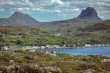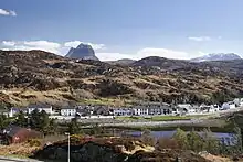 Lochinver (Loch an Inbhir in Gaelic) is a village that is located at the head of the sea loch Loch Inver, on the coast in the Assynt district of Sutherland, Highland, Scotland.[2] A few miles north-east is Loch Assynt which is the source of the River Inver which flows into Loch Inver at the village. There are 200 or so lochans in the area which makes the place very popular with anglers. Lochinver is dominated by the "sugar loaf" shape of Caisteal Liath, the summit peak of nearby Suilven.