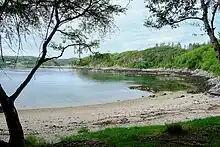 The beautiful White Shore is so-called for its gneiss and quartzite pebbles.[3] Is location a miles walk from one of two access point, one[4] from the peir, and the other at the head of Loch Culag locally known as the School Loch. The stone beach is surrounded by the Culag Woods which is managed by the Culag Community Woodland Trust (CCWT).