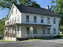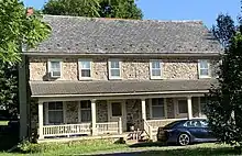 A fieldstone farmhouse was built in 1850[27] at the corner of Blue Church Road South and Beverly Hills Rd. This home design shows the German design influence with only four-across exterior bays with two rooms on the first floor on the Federal style, which is a symmetrical design with an arch window above door.[28] Originally, this house had a stucco exterior. The third home, on the southwest corner of the T-intersection of Blue Church Rd S and Beverly Hills Rd was constructed in 1880.[29]