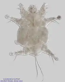 Locustacarus buchneri is a parasitic mite that lives in the respiratory air sacs of bumblebees.[2] They are relatively host-specific and are found primarily in the subgenus Bombus sensu stricto. Bees infested with the mite have a reduced lifespan in laboratory conditions,[3] and although in one study they foraged at a rate similar to uninfected bees, infected bees showed a greater preference for a single flower type.[4] Prevalence varies, but infection appears to be more common among commercial colonies than wild populations. Among colonies commercially imported from the Netherlands and Belgium to Japan, infestation rates were 20%.[5] In South America, prevalence is very low in native populations.[6] In Canada, there was evidence that commercial bumblebee populations were spreading L. buchneri to wild populations.[7]