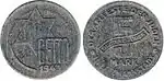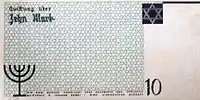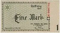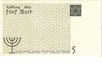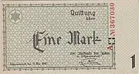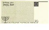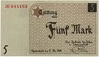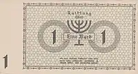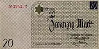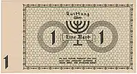 Lodz Ghetto mark (German: Mark, Polish: Marka getta łódzkiego) was a surrogate currency that circulated in the Lodz Ghetto in 1940—1944 until the Ghetto was liquidated in August 1944. It was divided into 100 pfennig (German: pfennig). The notes had no value outside the Ghetto, and could not be exchanged into other currencies.