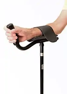 A forearm crutch (also commonly known as an elbow crutch, Canadian crutch or "Lofstrand" crutch due to a brand by this name) has a cuff at the top that goes around the forearm.[1] It is used by inserting the arm into the cuff and holding the grip. The hinged cuff, most frequently made of plastic or metal, can be a half-circle or a full circle with a V-type opening in the front allowing the forearm to slip out in case of a fall.