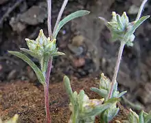 The 1/8-inch flower heads are surrounded by upper leaves of about the same length as the head.[2] Each head has tiny reddish-purple disk flowers with the outer 8–10 being all female.[2]