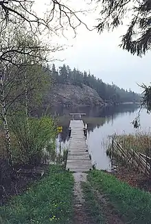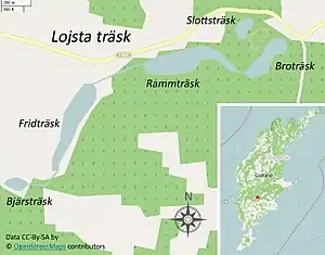 The Lojsta Lakes (Swedish: Lojstasjöarna) (sometimes referred to as the Lojsta Lake) (Gutnish: Lojsta träsk) are five lakes in Lojsta and Stånga sockens,[1] Gotland, Sweden. The names of the lakes are (west to east) Bjärsträsk, Fridträsk, Rammträsk, Slottsträsk and Broträsk. Their outflow is in the Storkanalen at Kvarnåkershamn on southweetsern Gotland. Four of the lakes are connected by manmade canals.[2] The Gutnish word for lake is träsk.[3] The Slottsträsk, the "Castle Lake", (sometimes known as Lillträsk) got its name from the Lojsta Castle, a Medieval defence-structure, situated by the lake.[4][5]