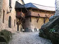 The Hussite Wars did not avoid Loket when it found itself in the hands of the supporter of the Catholic Church burgrave Půta of Illburk.[7] The Hussite troops tried twice to conquer the castle under the leadership of Krušina of Švamberk and later under the leadership of Jakoubek of Vřesovice, but both crusades ended without success. The comprehensive restoration of the castle under Wenceslaus IV was decisive for its present form. Of the original Romanesque buildings, those preserved were mainly the extremely rare rotunda, the foundations of the castle tower and those of the northern palace. The Margave's House also originated in the reign of Wenceslaus IV.